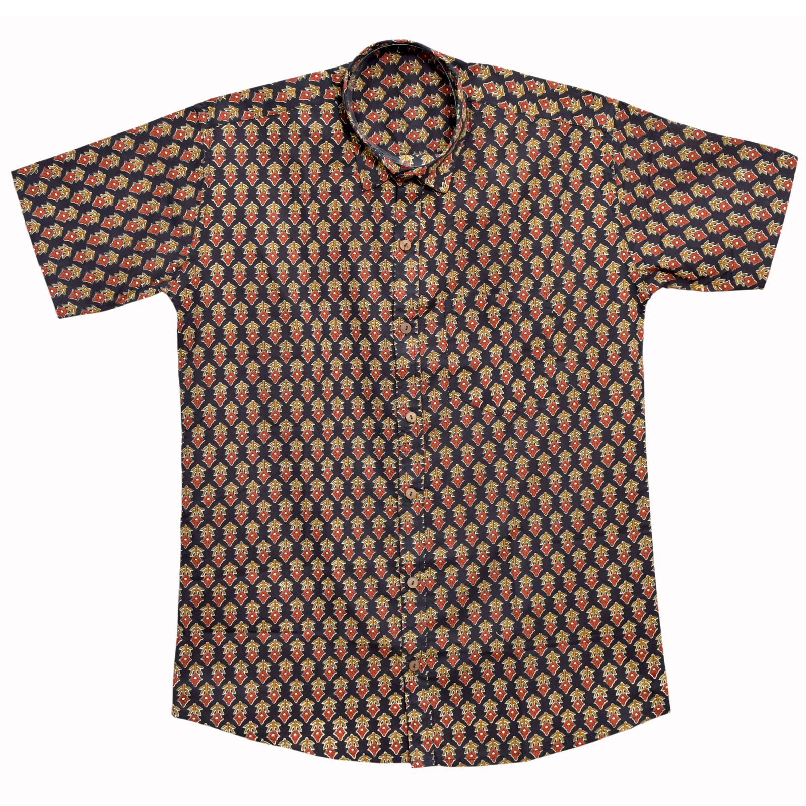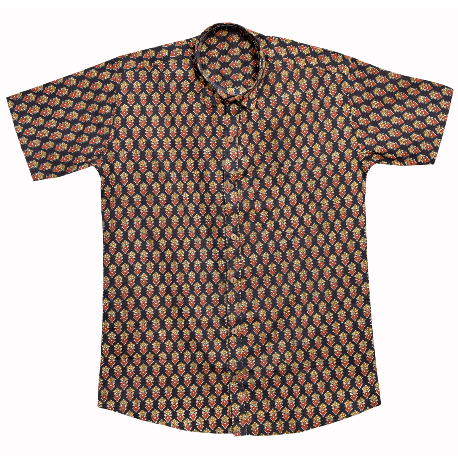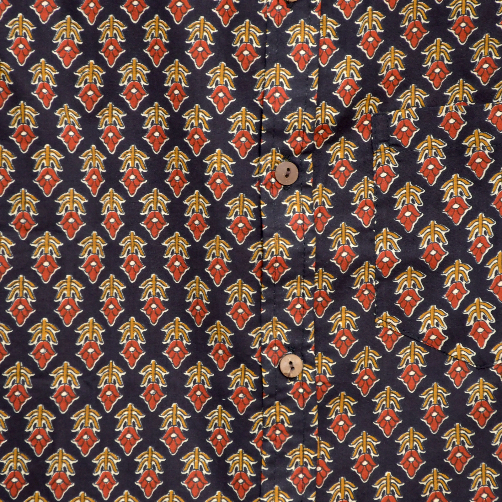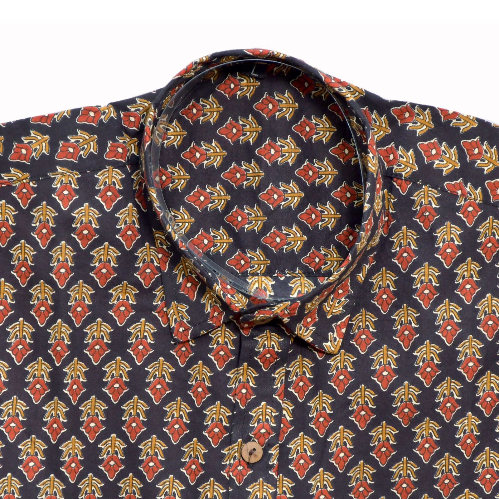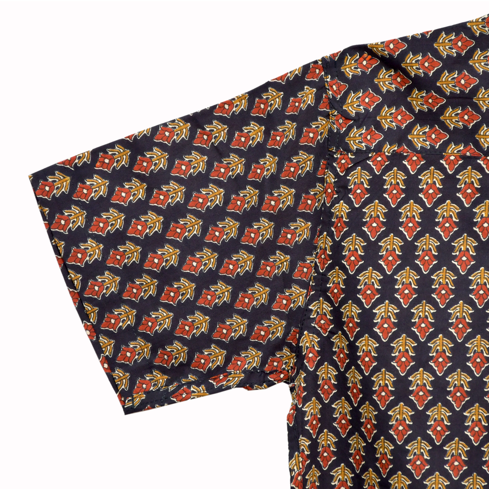 Add a touch of rich, earthy elegance to your wardrobe with the “Ember Petal” Shirt. This piece features a captivating red and yellow floral-inspired block print against a deep dark blue cotton backdrop. Its intricate pattern and comfortable fit make it perfect for adding a touch of sophisticated style to any look.