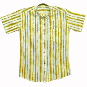 Add a touch of earthy elegance to your wardrobe with the "Golden Haze" Shirt. This piece features a unique batik print with soft yellow and green vertical stripes against an off-white cotton backdrop. Its relaxed design and comfortable fit make it perfect for adding a touch of artisanal style to any look.