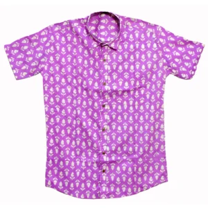 Add a touch of playful elegance to your wardrobe with the "Lavender Bloom" Shirt. This piece features a charming white floral block print against a vibrant purple cotton backdrop. Its unique design and comfortable fit make it perfect for adding a pop of color and artisanal charm to any look.