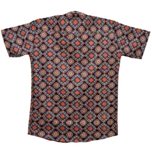 Make a statement with the "Mosaic Bloom" Shirt, featuring a captivating circular geometric print in vibrant hues against a rich maroon backdrop. This unique design adds a touch of retro-inspired style to your wardrobe, perfect for those who appreciate bold patterns and distinctive looks.