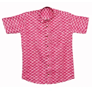 Add a playful and eye-catching touch to your wardrobe with the "Rose Zigzag" Shirt. This piece features a dynamic chevron-like geometric pattern in white and light pink against a vibrant pink cotton backdrop. Its unique design and comfortable fit make it perfect for adding a touch of modern flair to any look.