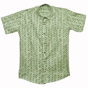 Add a touch of artisanal charm to your wardrobe with the "Verdant Lattice" Shirt. This piece features a unique white geometric block print against a soft green cotton backdrop. Its intricate pattern and comfortable fit make it a perfect addition to your casual collection, adding a touch of understated elegance to any look.